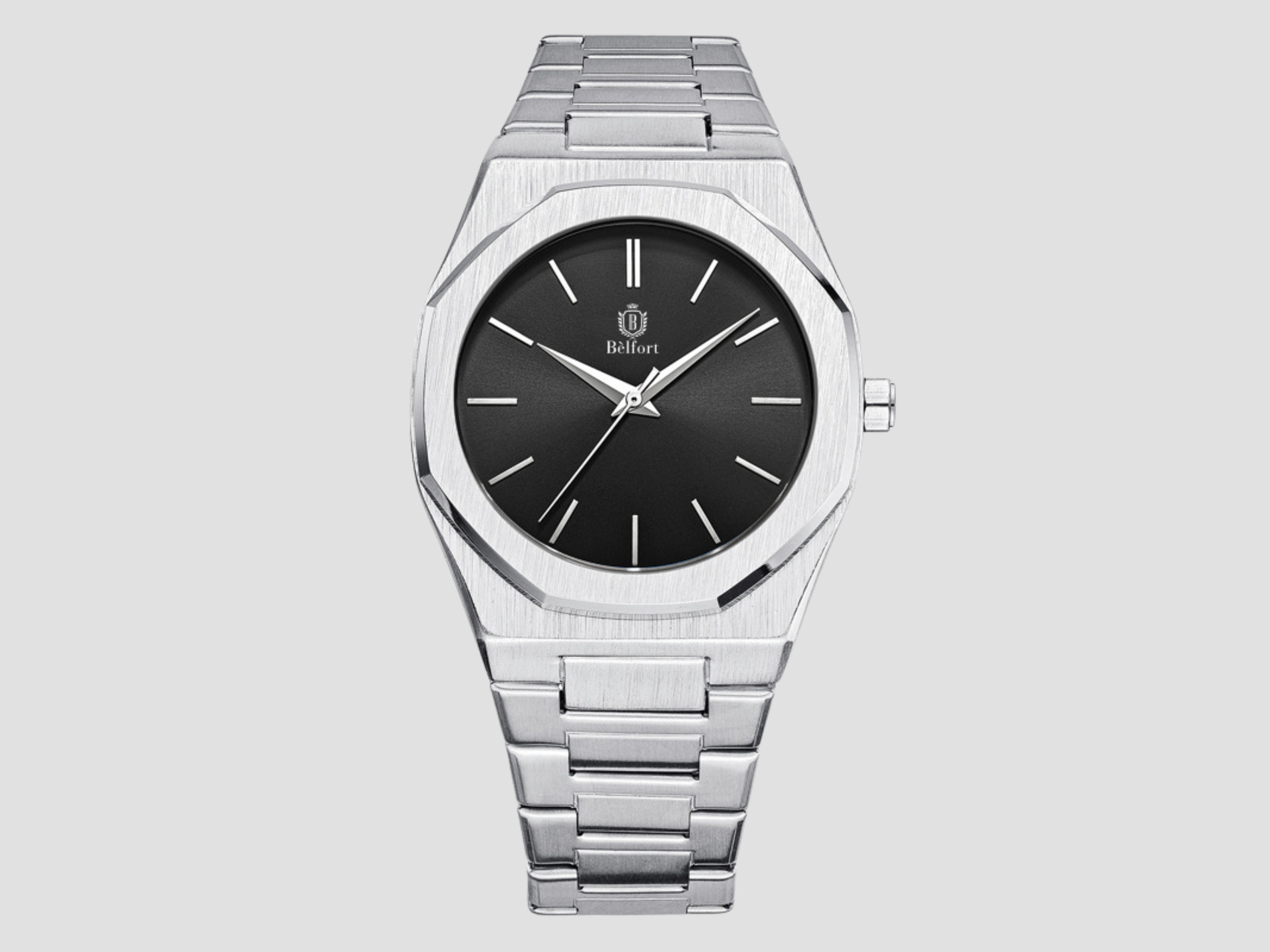 Met een delicate balans tussen modern minimalisme en tijdloze elegantie straalt dit horloge een discrete luxe uit die de aantrekkingskracht van de aristocratie weerspiegelt. De strakke zwarte wijzerplaat contrasteert perfect met de flexibele metalen afwerking, verkrijgbaar in zowel roestvrij staal als roségoud. Dit horloge is meer dan een accessoire; het is een statement van klassieke smaak en subtiele grandeur.
